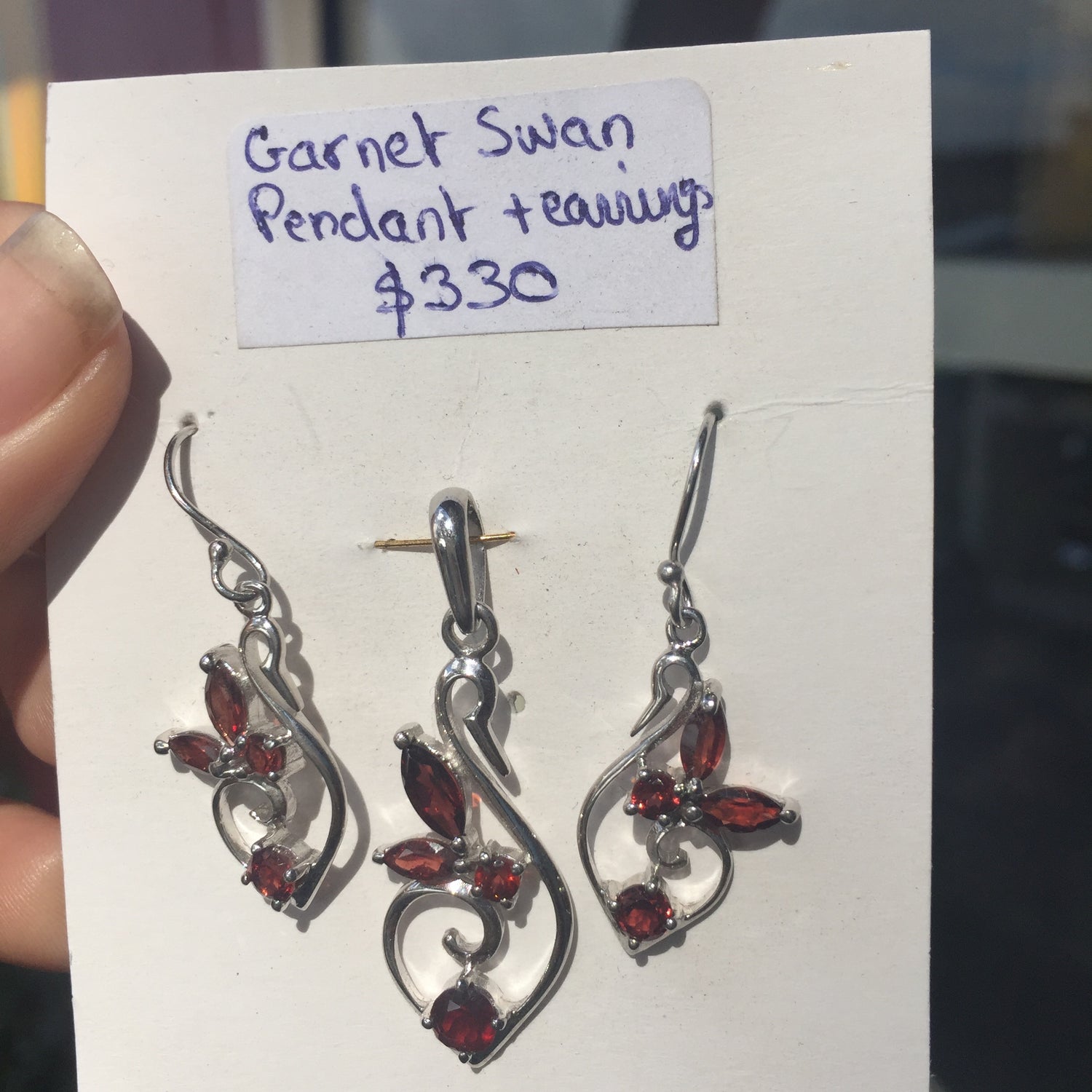 Garnet Swan Pendant + Earrings Sterling Silver Set